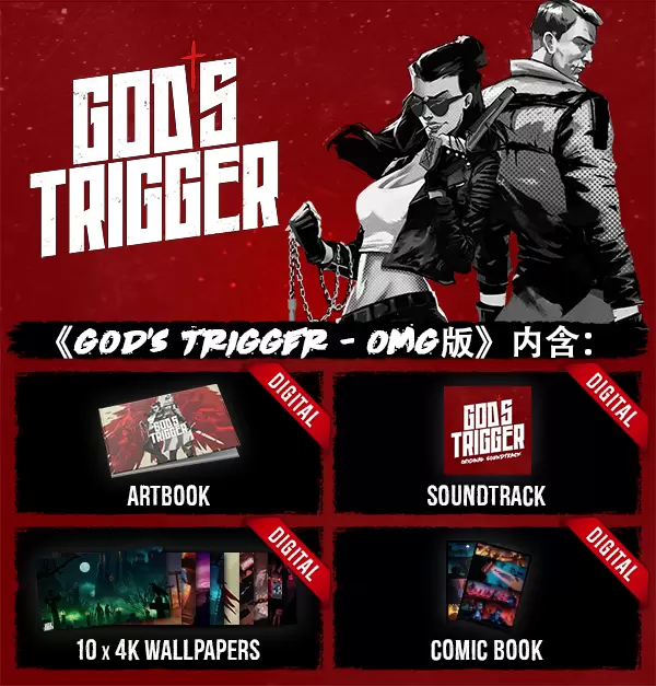 STEAM代购(豪华版):God's Trigger O.M.G. Edition包含内容:70多页的画册,其中有角色素描和关卡设计概念图 (内容很炫酷哦!)时长超过40分钟的游戏原声音乐,格式为mp3和无损的FLAC (黑胶唱片发售日期待定)10张高清游戏壁纸 (精美的画作是多多益善)短篇数字版漫画书 (专为既喜欢美术又喜欢剧情的玩家准备)系统需求