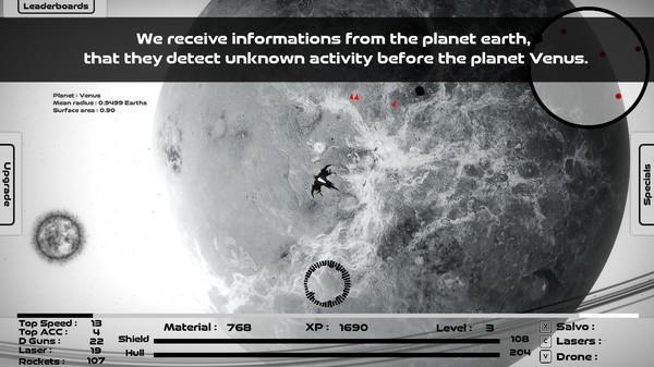 这是科幻类型的自上而下的2D动作游戏。玩家的角色是协助联盟的外星人种族解放我们的太阳系。玩家收集经验点和物质点,这些经验点和物质点是他通过摧毁太阳系中的敌方单位和小行星而获得的,然后升级飞船并使用特殊武器。通过结合自己的能力和提供的选项,玩家可以在游戏中进一步前进。