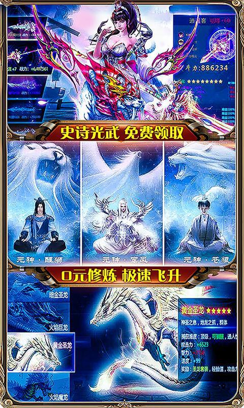 2、上线即送至尊满级V13,加强版VIP礼包免费送,还送88888绑元,888万金币。