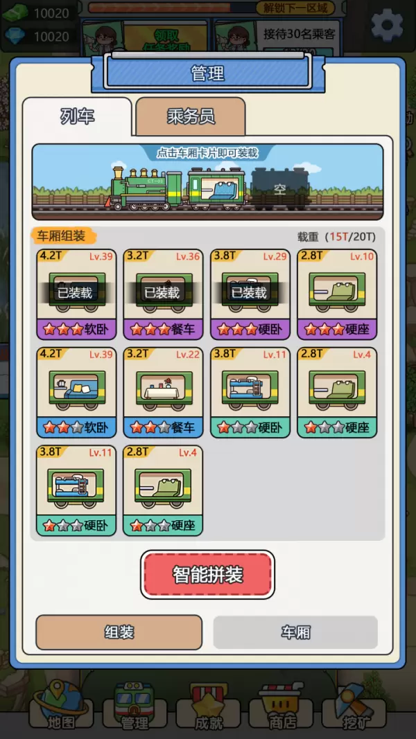 1、是一款休闲的放置手游,以火车为背景,合理规划路线,得到最佳收益。