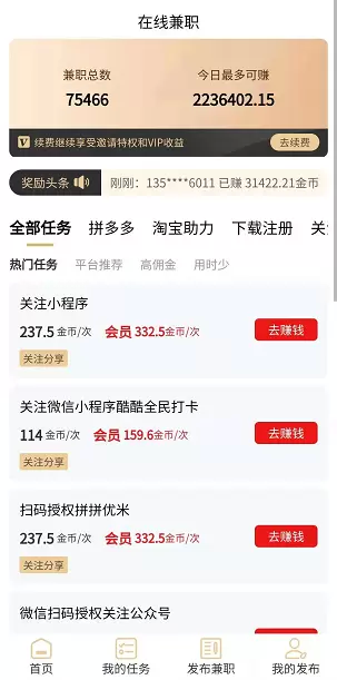 安心赚钱:赚钱任务批准后,奖金马上到账,放心!