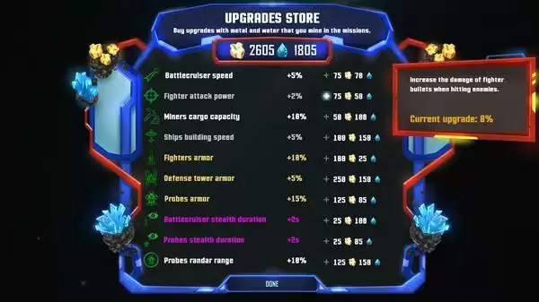 你还能储备未使用的金属与水资源,在商店中兑换舰队所需的升级与强化道具。这些升级道具可提升战舰速度与战力,增加最终获胜几率。