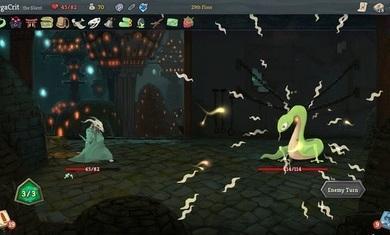 在塔中,玩家的战斗方式均为传统的卡牌战斗方式,回合制+卡牌战斗,每个角色初始均为3格能量,多数卡牌为1费或2费。轮到你的回合时,你可以对你的角色施以指令,操作非常简单,无需任何新手教程。一开始的时候,你只拥有基础初始攻击牌、防御牌和一张职业牌,随着游戏流程的推进,战斗、商店、宝箱以及随机事件都能让你获得具有多种特效的新手牌。