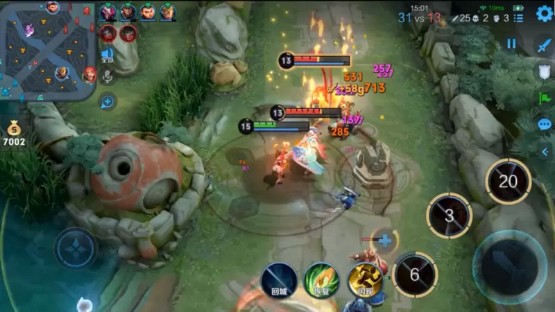 在对战过程中,小编发现本作的地图以及战斗的玩法都极大程度的还原了端游,玩家能在其中发现很多端游的影子。在屏幕的左上方有缩小的地图,能看到目前的敌我双方的防备塔的存留情况也能看到我方队友的所在位置。把握住这些才干准备好战略时时准备来一波美丽的伏击~~惟独推到了对方的水晶才干得到战斗的胜利。