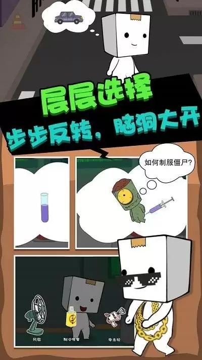 1、可喜欢的纸盒人置身丧尸小镇当中,解锁更多的道具使用,小心躲着僵尸;