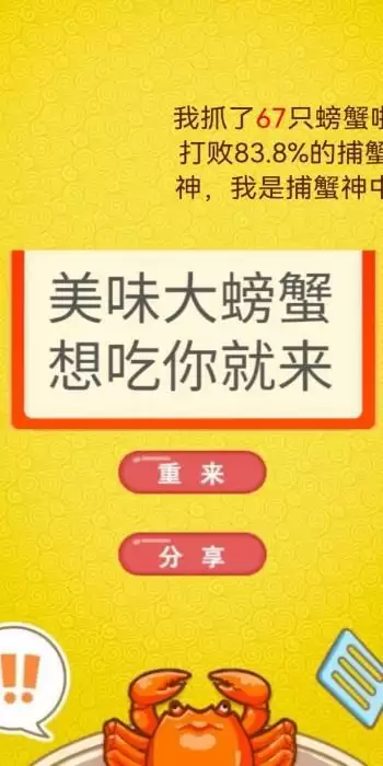 美味大闸蟹是一个超简单的放松挑战体验,30秒内点击螃蟹进行抓捕,螃蟹出来的速度会越来越快,抓得越多越好哦!