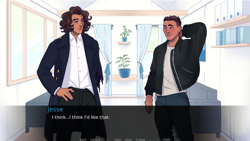 然后玩家就可以选择你想要投入哪段关系了。这里有4个角色,曾经有钱有颜但现在落魄的霸道总裁Jesse,长不大的“带电”老男孩Xander,18岁结婚如今妻子不辞而别的孤单胖仔Nathan,以及曾想做游戏设计师,现在捣鼓电子机械的大叔Ray。每个基友都会有不同的交往节奏,和不同的亲密接触的方式。