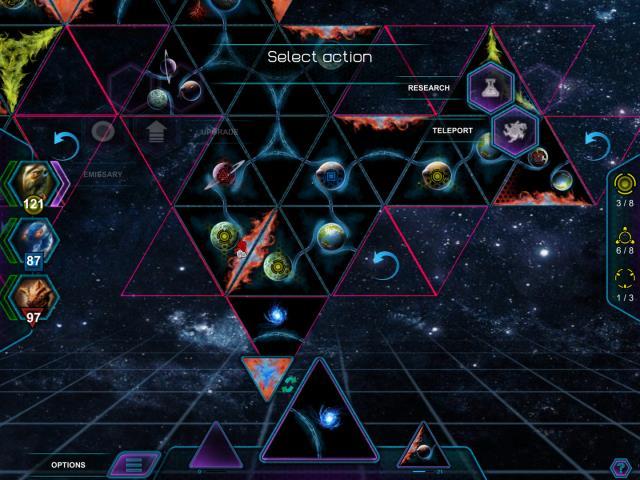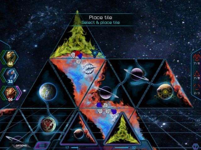 游戏画面采用了六边形棋盘设计,玩家在翻动每一个棋盘格子时,都会出现两个结果,可以在二者中选择一种发展自己的星际帝国,但每一次操作都会影响到接下来的发展。而且在资源有限的情况下,如何合理建设发展十分关键,若突然迈出太大的步伐可能会影响到全局,被其他人趁虚而入。该作十分侧重策略性,因此十分烧脑,不过感兴趣的朋友依旧值得尝试。