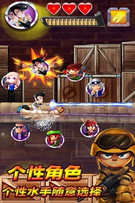 1、采用横版卷轴式的动作射击玩法,七种不同角色可以选择,七种不同的战斗方式;
