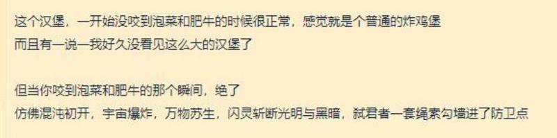 “这个汉堡,一开始没咬到泡菜和肥牛的时候很正常,感觉就是个普通的炸鸡堡
