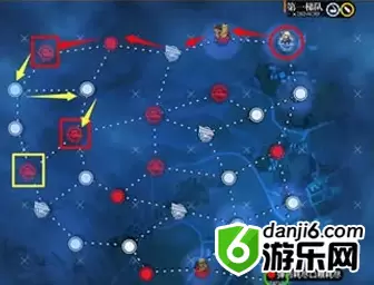 第一回合,红圈部署主力队(敌人有一定护甲,建议用火专AR),绿圈部署狗粮队,主力队沿红色箭头向右前进4格