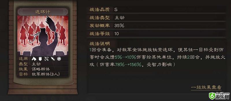 1回合准备,对敌军全体施放铁索连环,使其任一目标受到伤害时会反馈5%→10%伤害给其他单位,持续2回合,并施放火攻(伤害率78% → 156%,受智力影响)