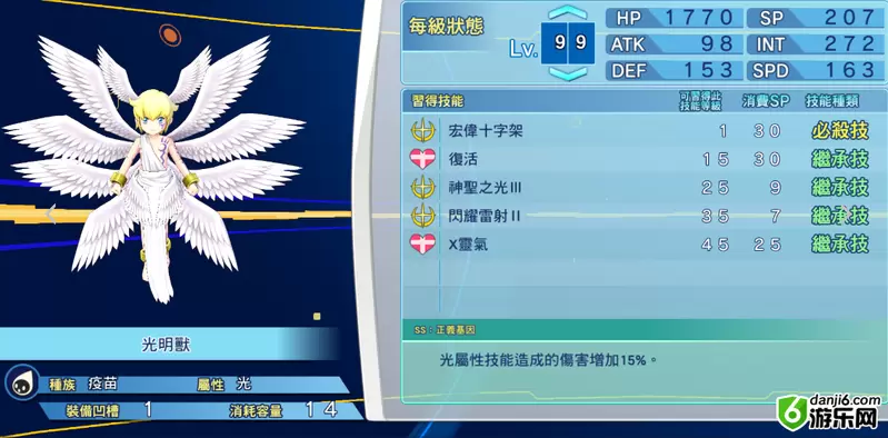 必杀技方面,群体中威力贯穿,被动增加的15%光伤配合此必杀清场效果还不错,如果还有增加光伤的数码兽同场,群体输出的效率也很惊人,甚至boss战都有不错的表现,当然平时还是老老实实拿神圣之光打输出就好。