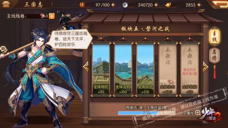 玩家在《少年三国志2》中获得三国志残卷后,便可以通过“成长-三国志”界面去激活里面的三国志模块,来让自己变强。每激活一个模块,全体的属性都会有所加成,在模块解锁到一定程度之后,便会产生更为突出的效果,比如激活到一定数量的残卷之后,我们主角少年的品质就会提升。此外主角的星级也会随着残卷的点亮而升高,从而带来更多的属性和战力加成。