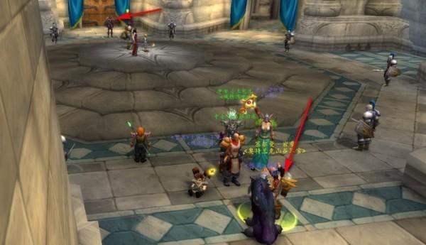 进入后在中间台子上围着几个黄色名字的npc就是战场军官了,奥山,战歌,阿拉希分别是不同的npc,点击他们对话然后选择我想去战场就行,箭头所指的是奥山军官