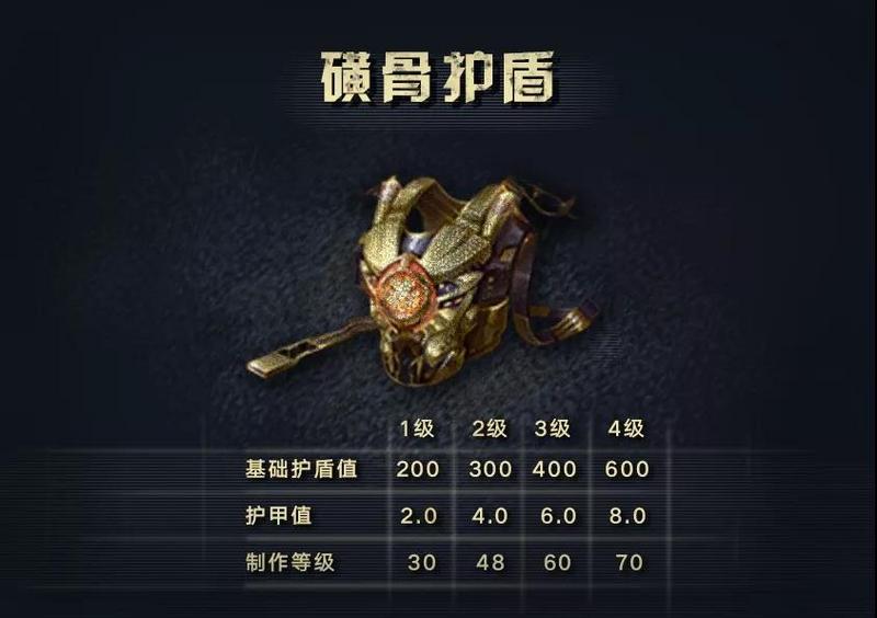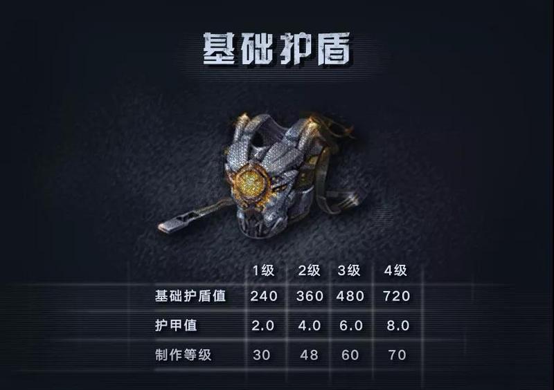 每种护盾都有四种不同的等级,随着等级的提升,护盾值与护甲值等属性,也会得到一定的提升,并且不同类型的护盾特点也不同。