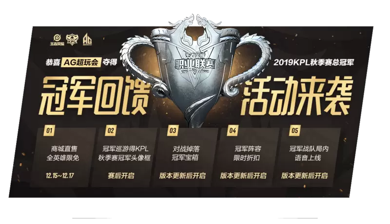 庆祝AG超玩会获得2019KPL秋季赛总冠军! 前往游戏内活动面板-限时可为冠军点赞,获得KPL2019秋季赛冠军信物。