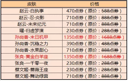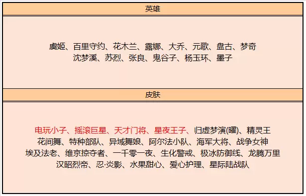 铭文碎片*5、钻石*5、永久英雄/皮肤/1日体验卡(曜、赵云、张良、孙尚香、蔡文姬、曜-归虚梦演、赵云-未来纪元、张良-一千零一夜、孙尚香-水果甜心、蔡文姬-蔷薇王座)
