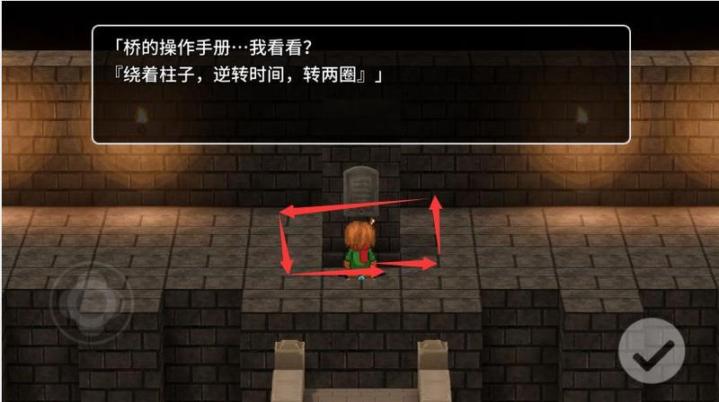 如法炮制,来到第二格柱子面前,提示说要绕着柱子逆时针走两圈。我们按照提示走就行了,值得注意的是在这里就别按跑步键了,摇杆也不要松手一口气走两圈,便可激活开关。