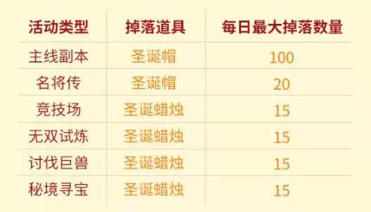 完成竞技场挑战,无双试炼,讨伐巨兽以及秘境寻宝均可获取节日限定道具圣诞蜡烛。