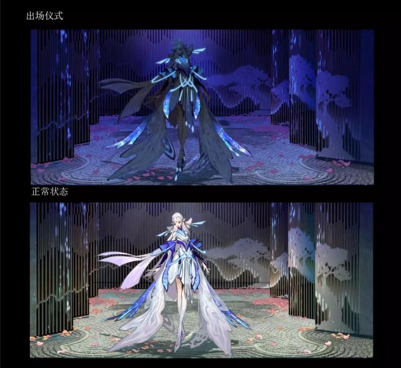 开场时的黑屏,参考了激光舞的设定,紧随其后的展示舞蹈与音乐参考引入了唐代的宫廷元素。同时在貂蝉的身后,使用了新中式风格的屏风作为背景,加强整体包装。