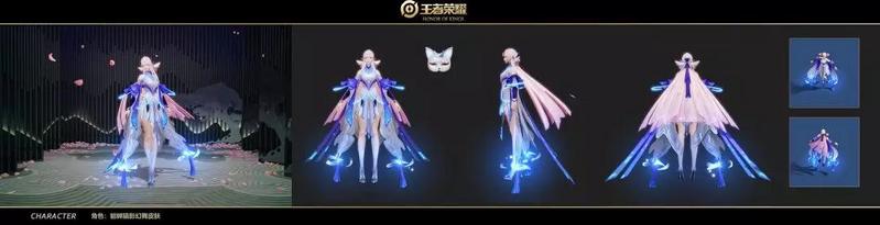 貂蝉这款皮肤的背景故事与未来的巫祝有关,因此在设计过程中,保留了貂蝉外形特点的同时,赋予了她更多的未来科技感。将其包装为一个以舞姬的形象来隐藏自己真实身份——通过情报来控制战争的未来巫祝组织领袖。