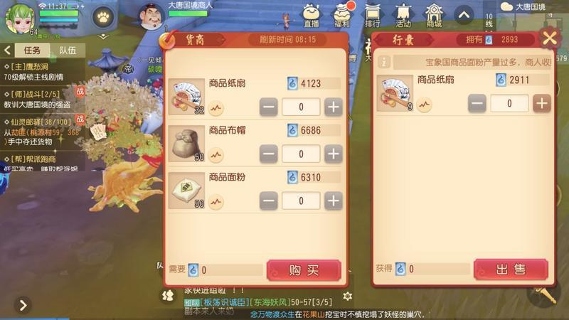 我手中囤的扇子收购价格最高的是沙市商人和长寿村商人,因此我们只要跑一个地图就能到了,把扇子一口气贩卖给当地的商人,回笼资金。运气好的话,直接达到12万就可以回帮派。