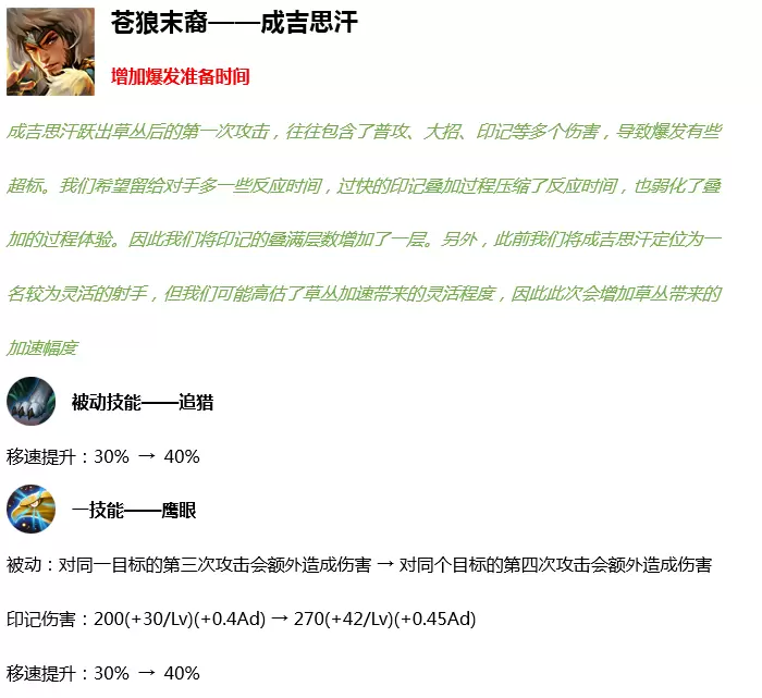 每次普攻击对敌人造成10%减速,最多叠加两层,持续2秒,并附带2段灼烧效果,每段造成20~48点伤害 → 每次普攻击对敌人造成15%减速,最多叠加两层,持续2秒,并附带2段灼烧效果,每段造成30~128点真实伤害,伤害效果对野怪会强化为60~256点。