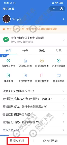 2、进入腾讯客服小程序之后,点击左下角的【提交问题】