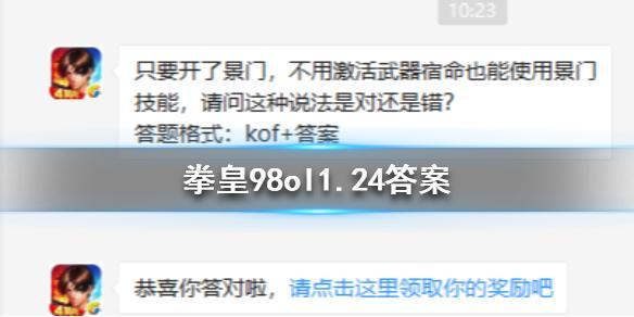 只要开了景门,不用激活武器宿命也能使用景门技能,请问这种说法是对还是错?这是拳皇98终极之战ol手游微信2020年1月24日每日一题的问题。还有很多玩家不是很清楚吧,那么答案是什么呢?