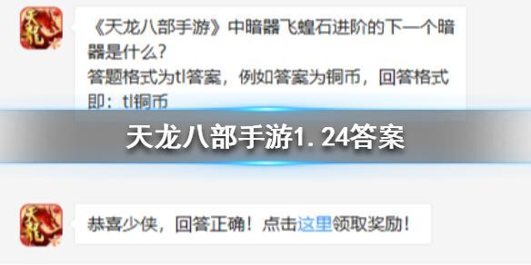 《天龙八部手游》中暗器飞蝗石进阶的下一个暗器是什么?这是天龙八部手游微信每日一题的题目,答题格式为tl答案,例如答案为铜币,回答格式即:tl铜币,下面小编就为玩家带来天龙八部手游微信2020年1月24日每日一题答案,一起来看看吧。