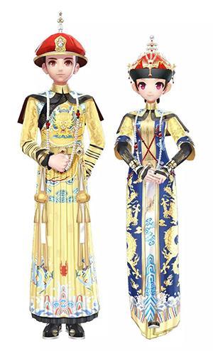 龙袍之上九龙盘旋,祥云舞动,彰显着九五之尊,万世升平。明黄的凤袍上凤穿牡丹,深蓝的朝褂上金龙飞舞,威严华丽。