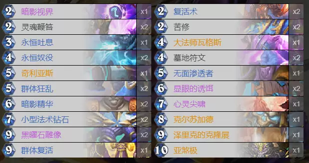 前期主要是交法术解场苟住。双灵魂鞭笞,苦修,永恒吐息过渡二三费,五费打暗影狂乱,无面渗透者。剑宗主要是通过暗影精华,拉怪复活墓场的随从,加上了显眼的诱饵可以配合拉key牌。