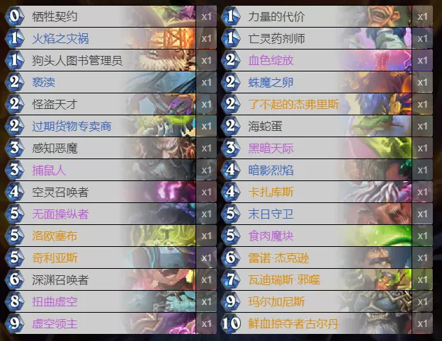 值得一提的是,血色绽放是整套卡组的亮点,血色接扭曲虚空可以强解治安术一波启动,打环境中为数不多的慢速卡组也可以血色加卡扎库斯的十费大药,终结斩杀也可以控2费血色姐夫炎爆,整体来说提高了卡组的灵活度,喜欢玩术士的玩家可以尝试这套牌。