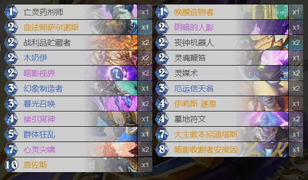 我们使用厄运信天翁、墓地符文、幻象制造者、阴暗的人影弄脏对手牌库,使其手牌资源耗光后慢性死亡,而伊莉斯的挖宝和大主教是我们后期战力的保证。