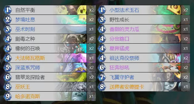 德鲁伊有着优质的抗快攻能力,完全可以平稳过渡到中期。整体的打法思路是前期梦境吐息跳费加橡树的召唤抵挡前期攻势,6费狂奔怒吼拉出飞翼守护者可以极大程度地拉开节奏,然后每回合一个大墙给对手压力,后期再依靠自然平衡自己的哈多诺克斯劝退对手。