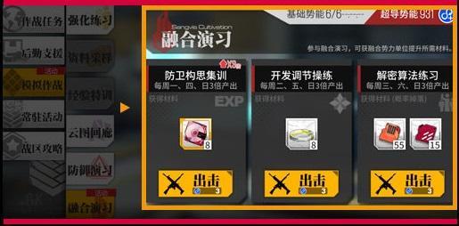 融合演习分为3个作战关卡:防卫构思集训、开发调节操练、解密算法练习。3个作战关卡分别每周有3天可获得3倍收益。