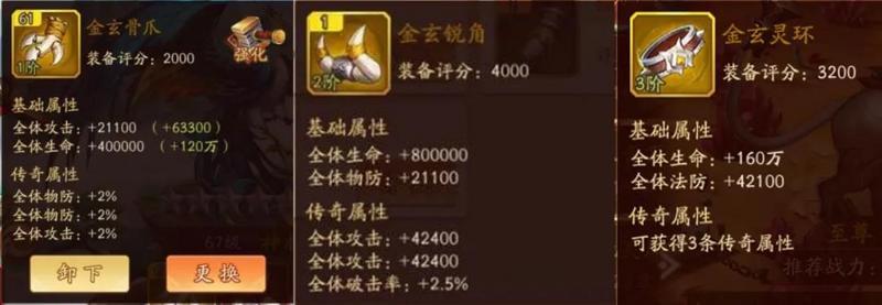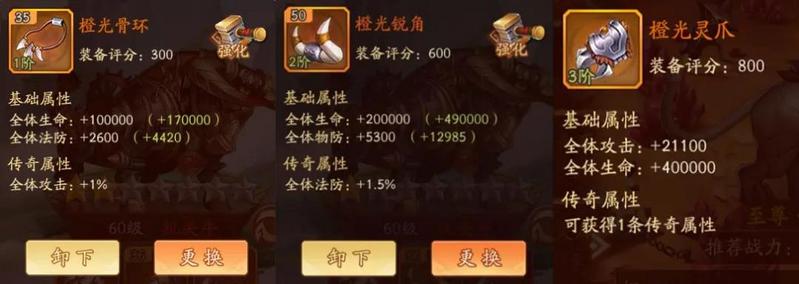 橙兽装3阶传奇属性:攻击(2%、21100),生命(2%,400000),物(法)防(2%,10500)