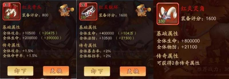 红兽装3阶传奇属性:攻击(2.5%、42400),生命(2.5%,800000),物(法)防(2.5%,21100)、命中率、闪避率、暴击率、抗暴率、格档率、破击率(2.5%)