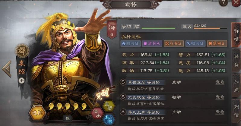 袁绍:弓/器械S,武力、智力、统率、速度都有着不错的加成,没有特别突出的一项。