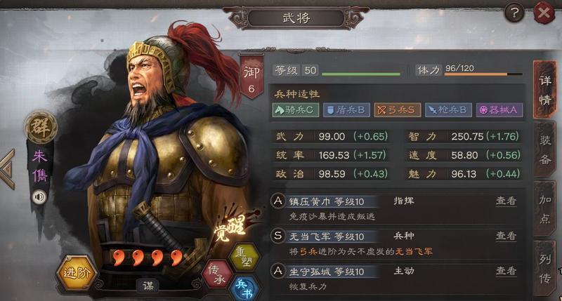 朱儁:弓兵S,器械A,虽为4星武将,但其智力有着1.76的加成,满红满级朱儁50级的面板如上图,统率也有不俗的1.57。速度和武力较为低下。