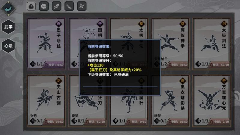 版本更新之后,在秘籍界面,每个武学或心法下方的参研等级将可以点击,点击即可查看当前等级以及下一级的参研效果。