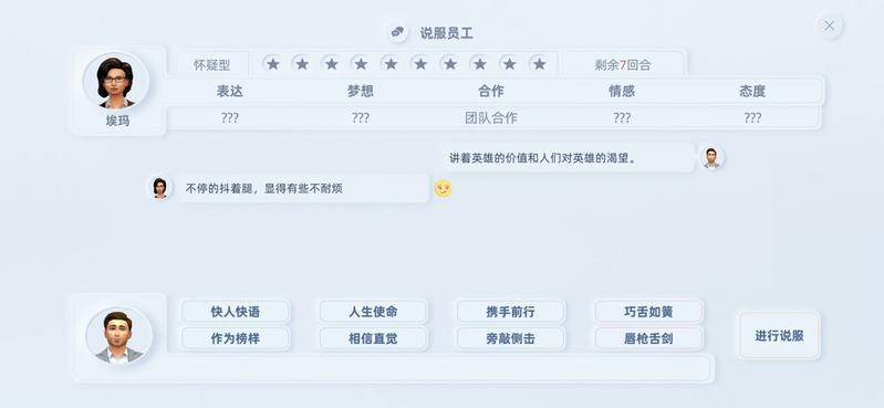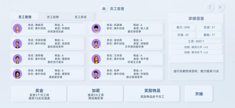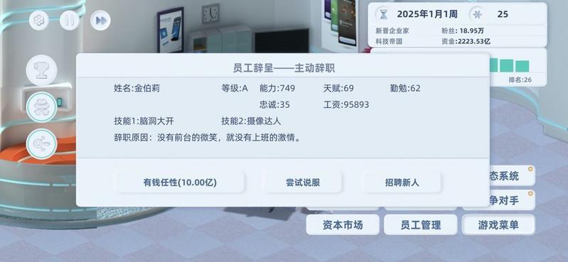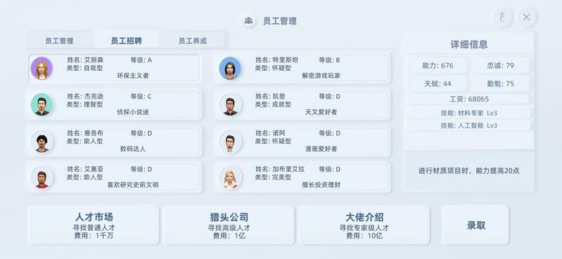 3、C级员工可以直接招聘,B级有一定概率触发说服系统,A级和S级必须说服她。如果你发现了优秀人才,又对自己的说服技巧没信心,可以去“资本市场”买对应等级的道具书(一次只卖一本),资本市场也是半年刷新一次。