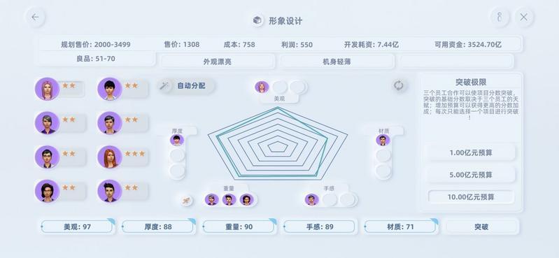 "卖点的完成难度是不一样的,在初期硬件卖点的难度相对偏高,设计和软件相对容易。在初期特性要求100分的卖点,通过拉条或者堆硬件是很难完成的,如果合理使用“突破”功能,整体的完成难度会降低很多。另外在初期也不建议去做有100分特性要求的卖点。