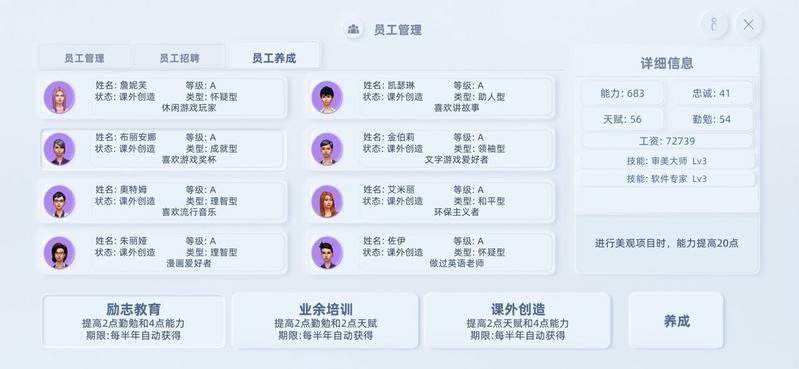 2、具体怎么养成,要看员工的属性特点。比如一个员工是(勤勉50点,天赋20点),推荐选择第一个加勤勉和能力的养成策略。如果员工时(勤勉20点,天赋50点),那么这个员工比较适合用于团队突破,可以选择加天赋和能力的养成策略。每次养成花半年时间,养成完成左下角会有提示,这个时候注意要继续培养。养成虽然加的能力不多,但是时间越长差距就越明显。