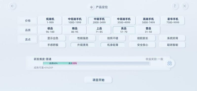 2、初期建议选择“中端”或者“中低端”,相对比较保险。员工能力和科技上去之后就可以尝试中高端以上的手机了。