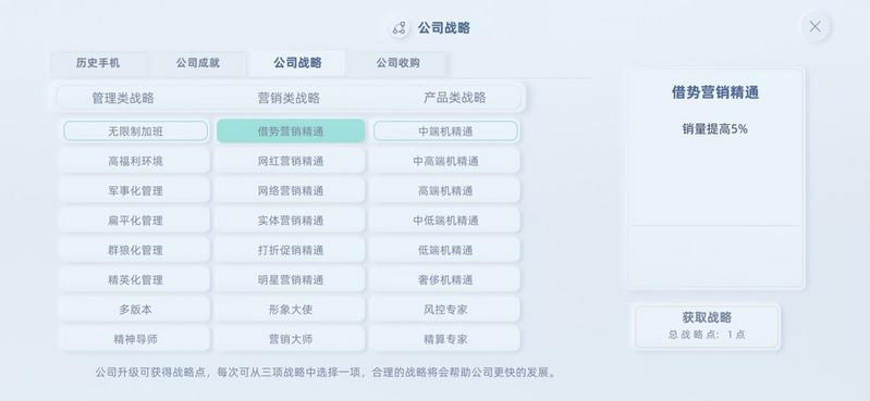 1、每次公司升级会获得一个战略点,研发的手机分数越高,公司升级速度越快,新图纸有20 % 的经验加成,新的卖点组合会有50%的经验加成;