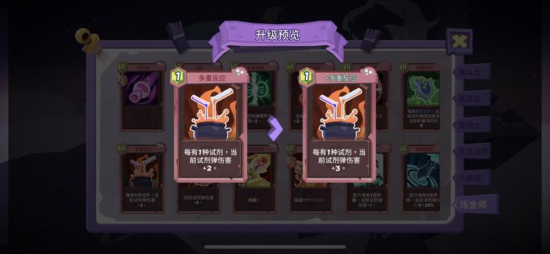 炼金的机制是靠炼金子弹打伤害,所以玩法主要围绕子弹展开,提高单发子弹以及后续伤害或者提高发射频率打伤害,所以以加槽和减槽做个简要分类好了。