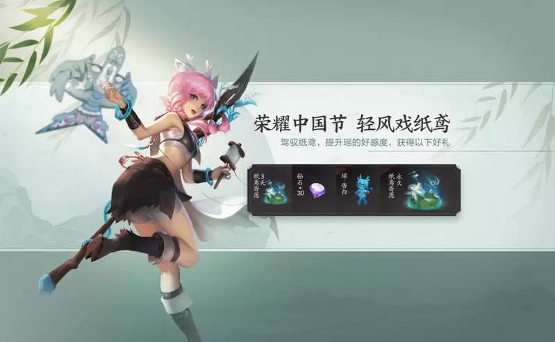 在游戏中,瑶会作为“纸鸢大使”带玩家参加多种活动。收集暖春幸运树,即可兑换永久皮肤、永久英雄,花木兰-兔女郎、安琪拉-玩偶对对碰、瑶、云中君等永久好礼奖励自选其一。