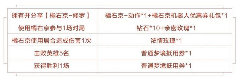 参与活动得亲密度道具、普通梦境抵用券,拥有并分享橘右京-修罗,还可获得专属个性动作、SNK机器人优惠券等好礼。